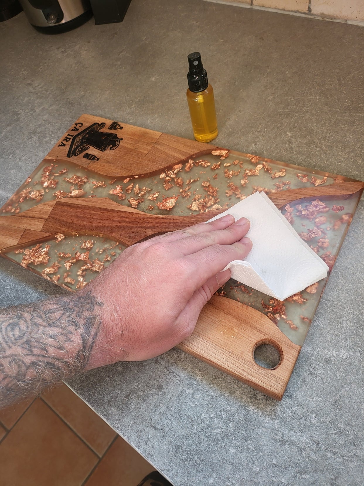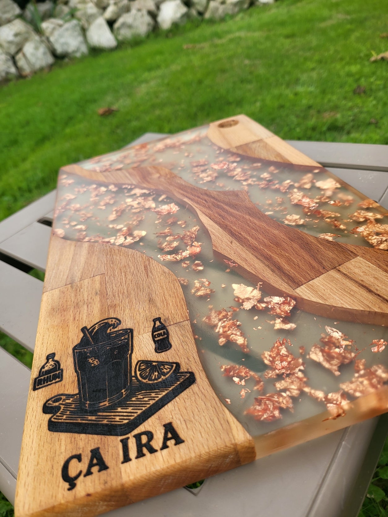 - Matériaux : Hêtre lamellé collé, Résine époxy de qualité alimentaire, inclusions de paillettes/copeaux cuivrés.